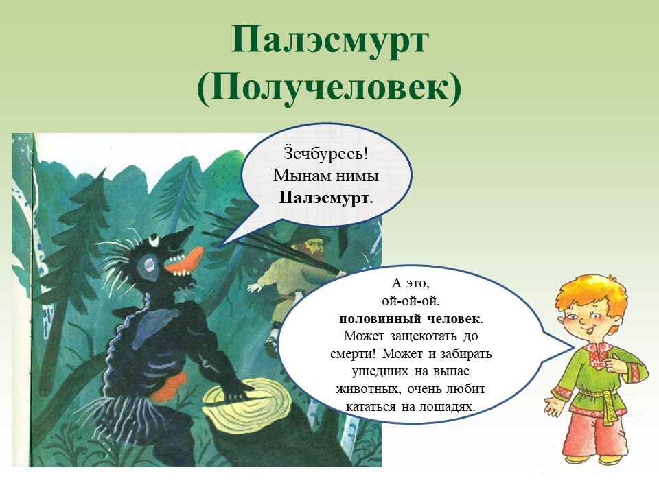 Саму встречу мы провели по материалам, подготовленным краеведческим отделом библиотеки. Многим современным ребятам очень нравятся страшилки, поэтому мы использовали мультимедийную презентацию о персонажах удмуртской мифологии. Например, Палэсмурт (половинный человек ) очень похож на страшилок из популярной среди младших школьников компьютерной игры "FNAF" (Five Nights at Freddy’s).